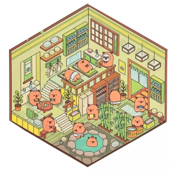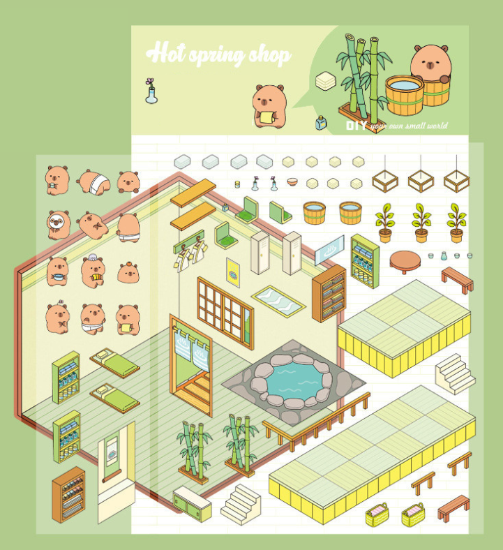 Lipdukų rinkinys "Hot Spring Shop". 1 pagrindas + 2 lipdukų lapai. 150 x 150mm